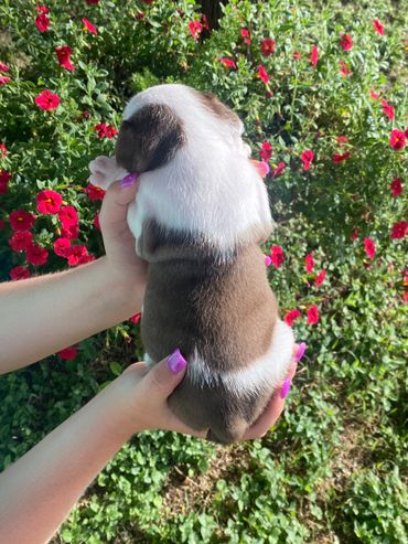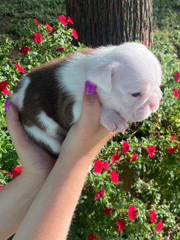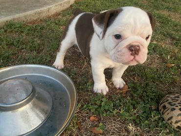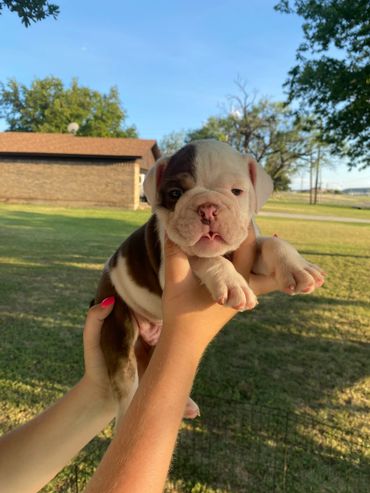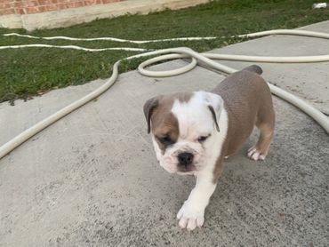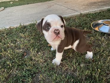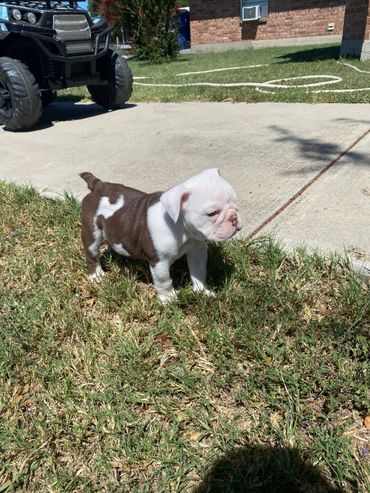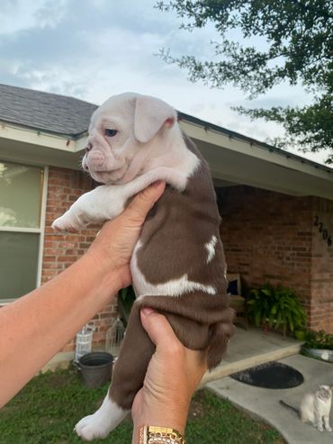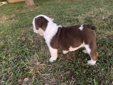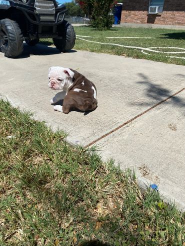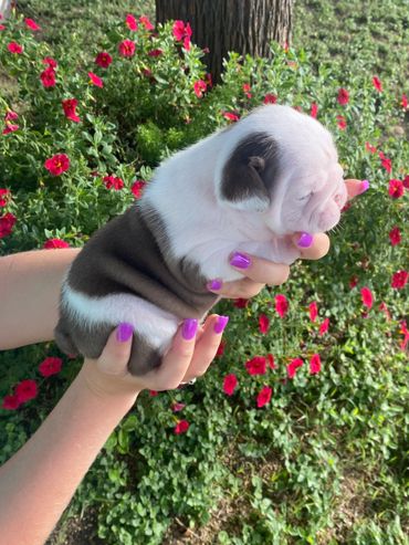 BODACIOUS AKA "BODIE" is a gorgeous AKC Registered Chocolate Seal Male English Bulldog that is A TRIPLE CARRIER Sired by LITTLE BIG FOOT (a Lilac Tri Male That Was Sired By BIG FOOT) and out of BREAK DA BANK BULLDOGS "KOOKIE" (a Black Seal Sired By WELLBRED'S MACK DADDY)! He has that gorgeous Dark Chocolate Color, those beautiful piercing Green Eyes and is super stout standing as wide as he is long with tons of bone