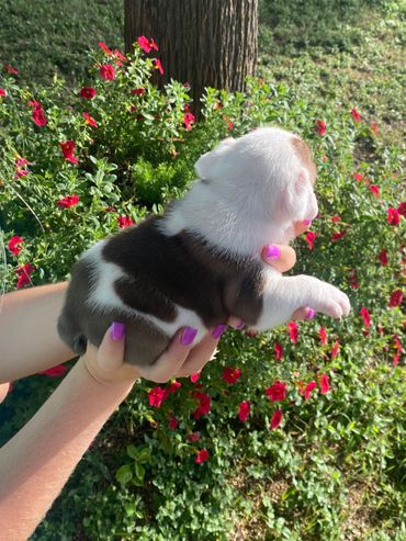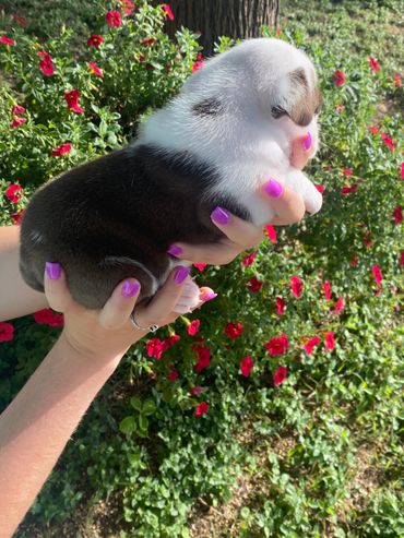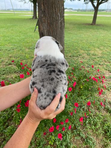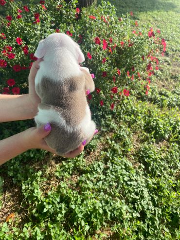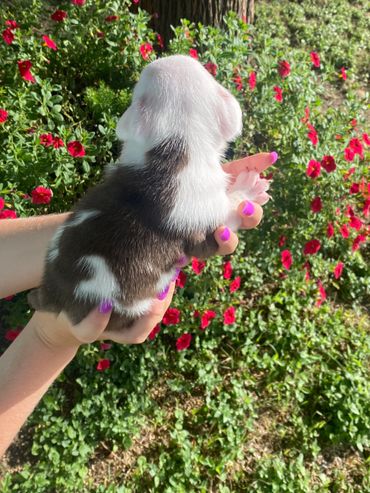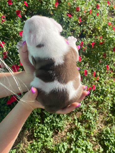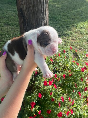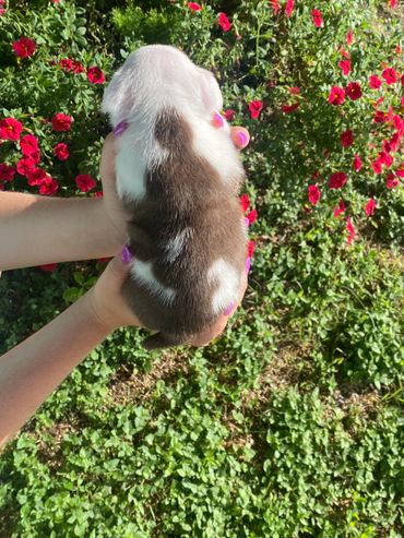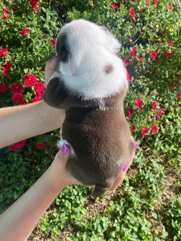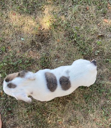 Sugar Bear XXXVII AKA "Sugar" is a white piebald female that is a chocolate carrier. Sired by Juarez's Luxor El Chocolate. She is petite and has the best personality.